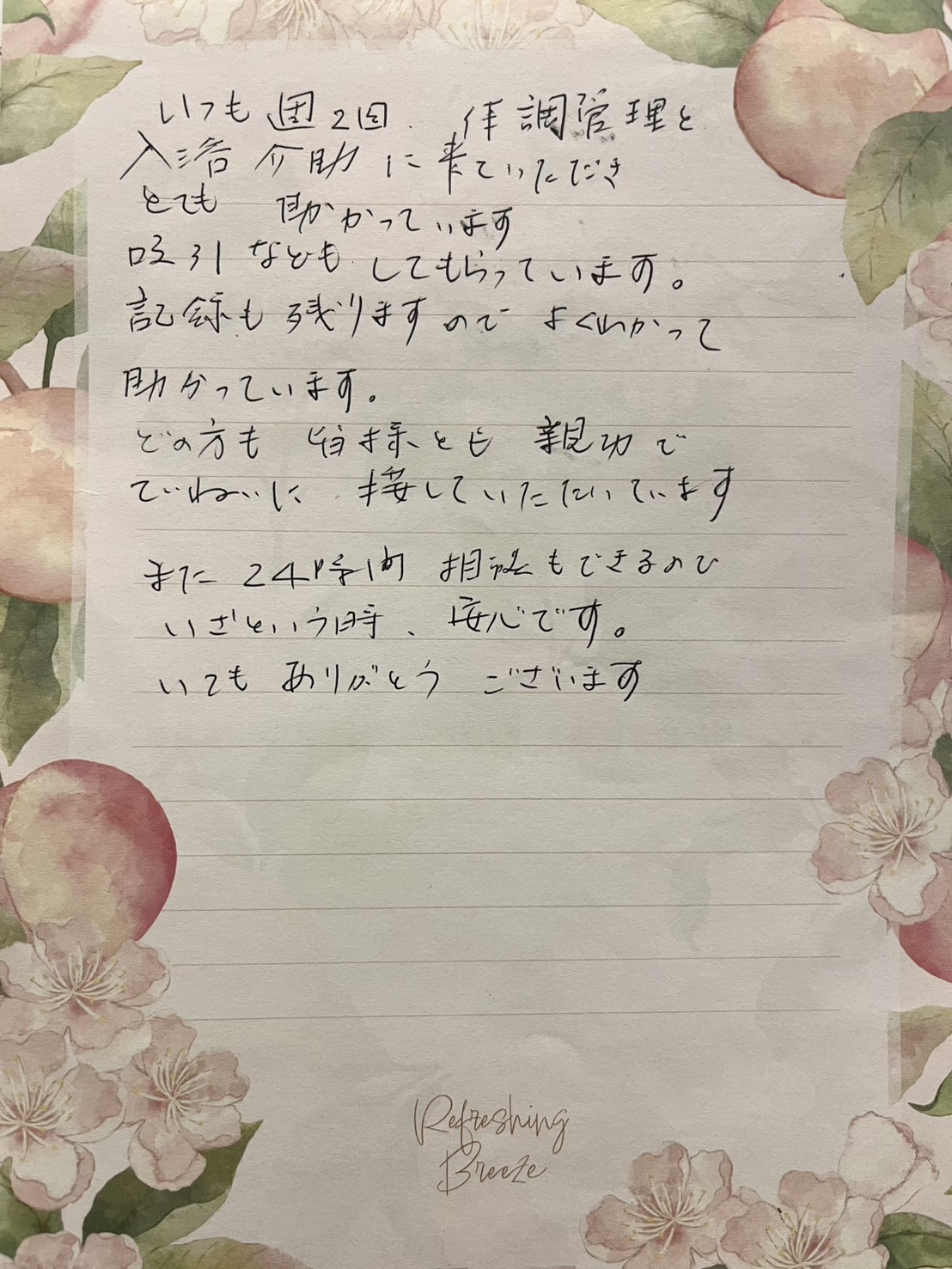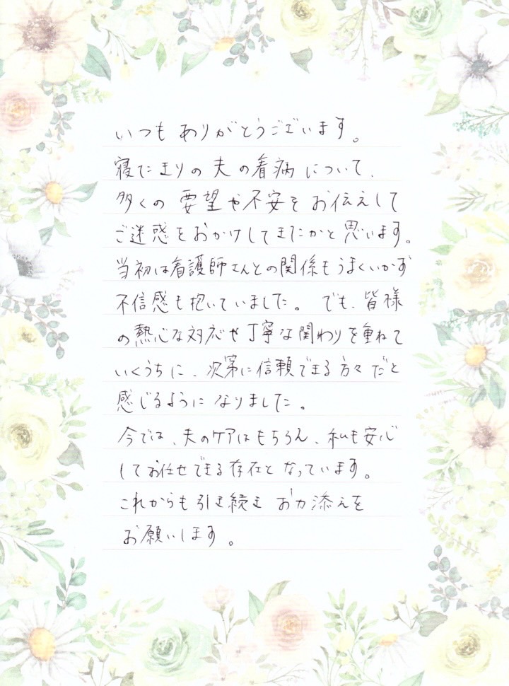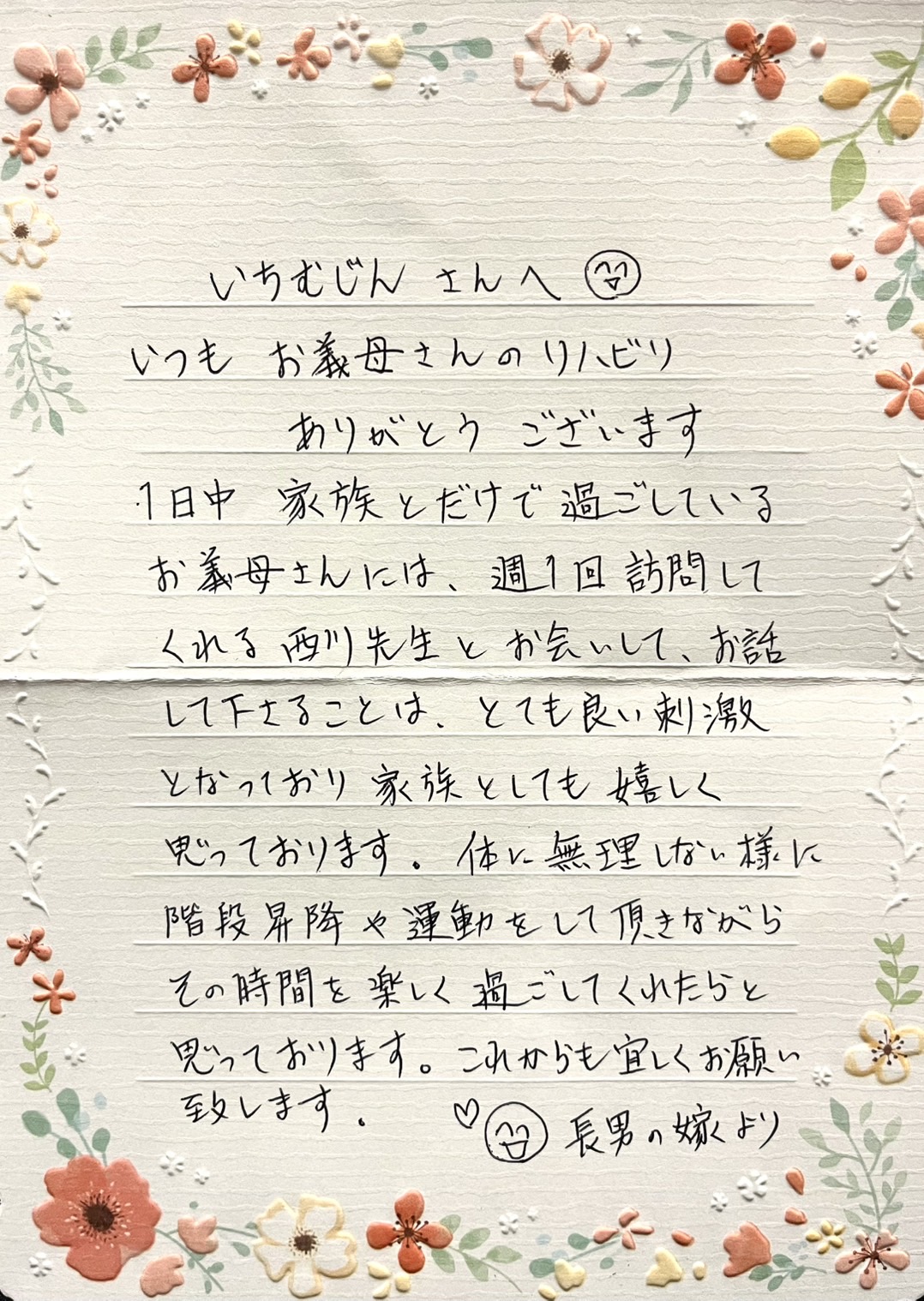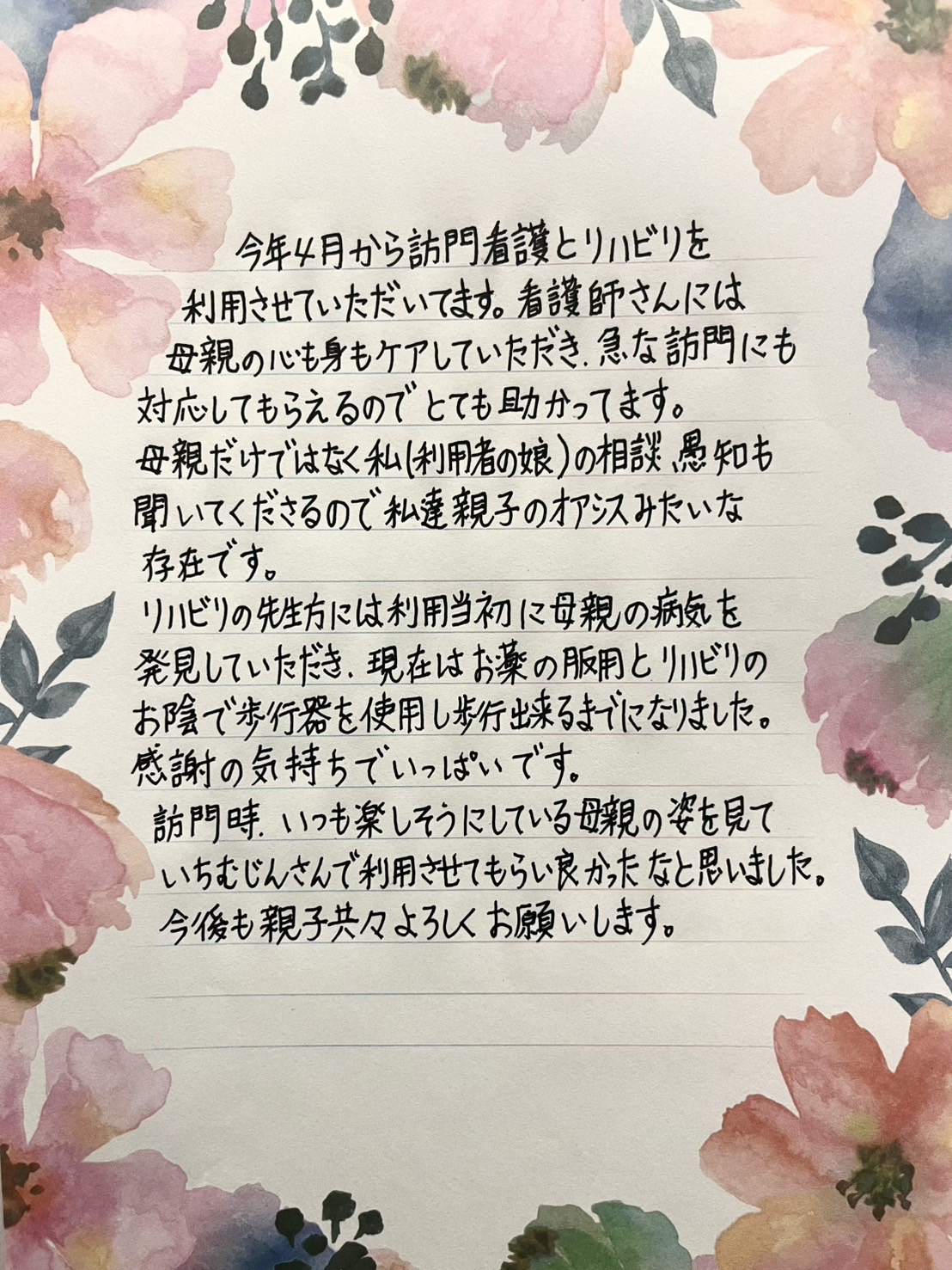 いちむじん訪問看護ステーションのサービスをご利用の皆様よりいただいた声、お手紙をご紹介します。