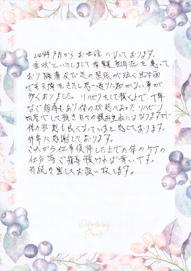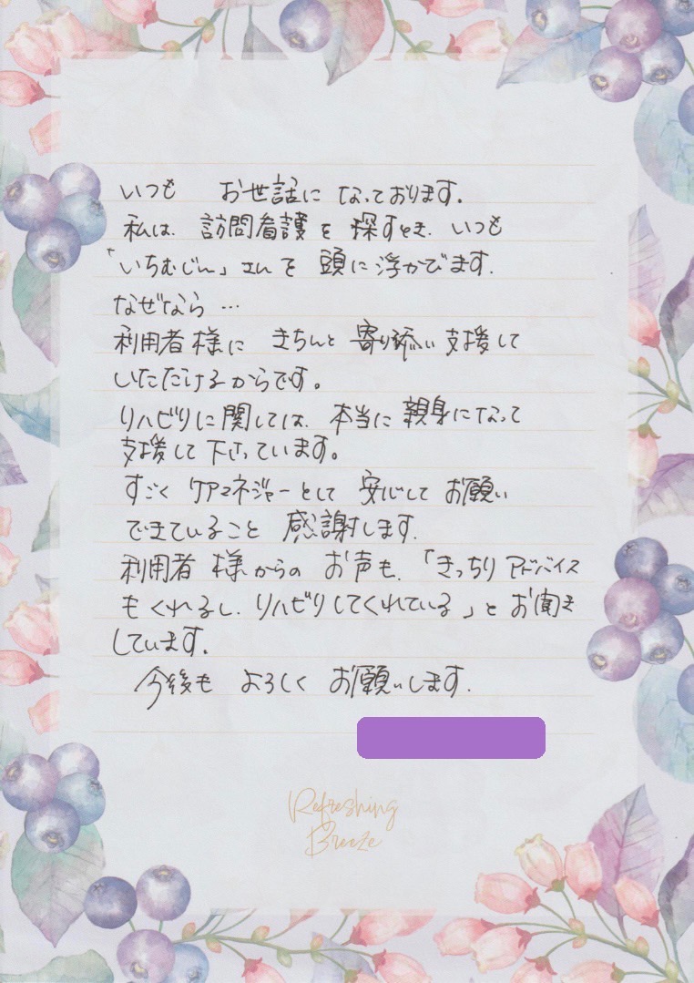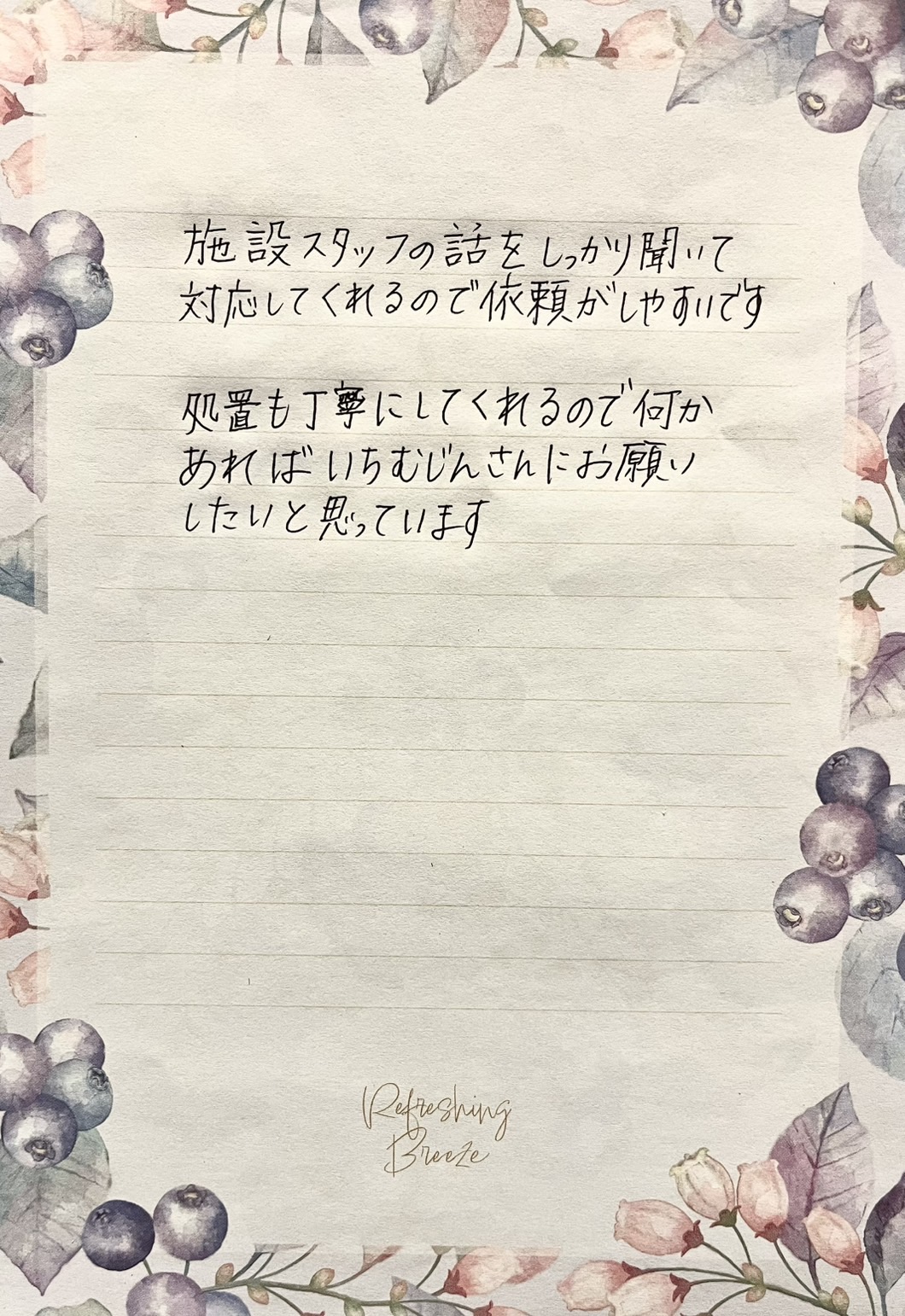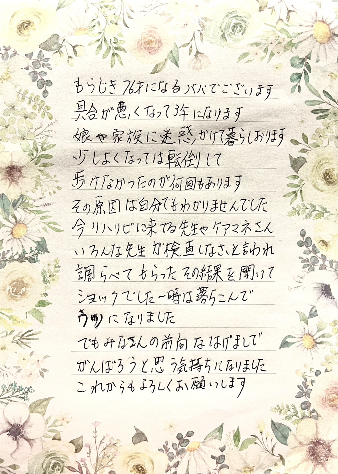 いちむじん訪問看護ステーションのサービスをご利用の皆様よりいただいた声、お手紙をご紹介します。