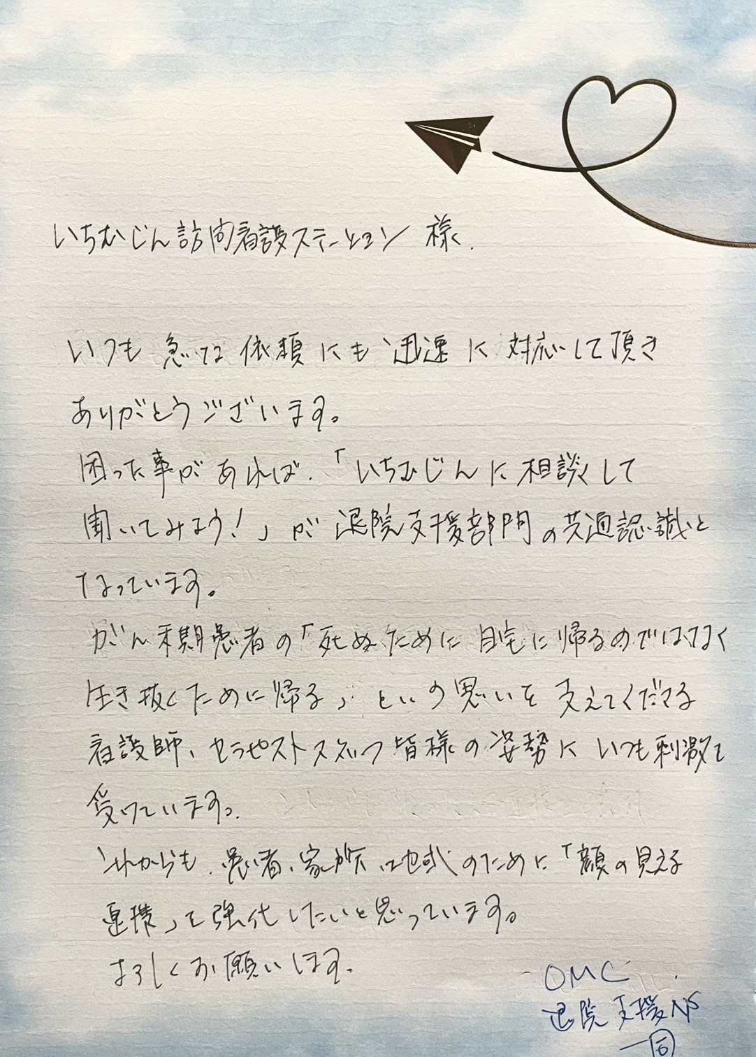 いちむじん訪問看護ステーションのサービスをご利用の皆様よりいただいた声、お手紙をご紹介します。